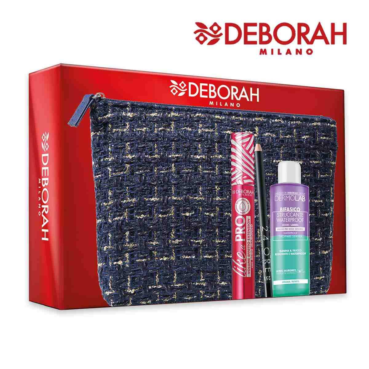 Pochette foderata COLORE BLU contenente: mascara LIKE A PRO ACIDO IALURONICO cod. MDV005323 + matita occhi 24ore n.251 cod. 011208 + mini struccante bifasico dermolab cod. TDM000621