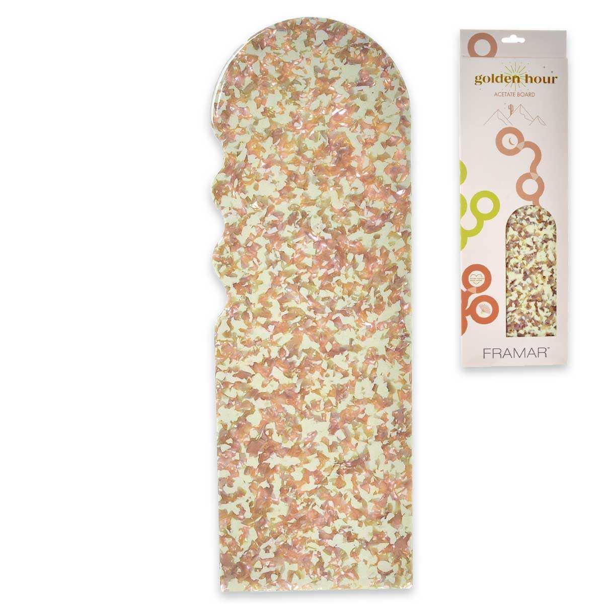 Framar - Acetate Board Golden Hour Framar Acetate Board Golden Hour è uno strumento innovativo per parrucchieri professionisti che unisce funzionalità e stile. Questo prodotto unico è progettato per facilitare il lavoro durante la colorazione dei capelli, offrendo al contempo un aspetto estetico. La tavola è realizzata in acetato di alta qualità, garantendo durata e facilità di pulizia. Il suo colore dorato aggiunge eleganza a qualsiasi salone di parrucchiere, rendendo il lavoro ancora più piacevole. La forma ergonomica e la leggerezza del prodotto lo rendono comodo da usare, e la superficie appositamente progettata impedisce alla lamina di scivolare, consentendo un'applicazione precisa e rapida della tinta. Framar Acetate Board Golden Hour è uno strumento essenziale per qualsiasi parrucchiere che apprezzi qualità, comfort e stile.