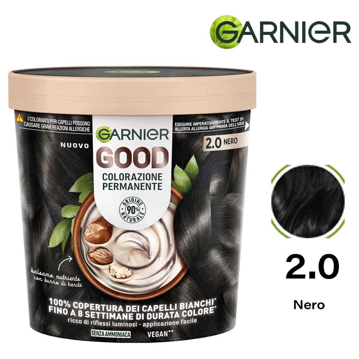 COLORAZIONE PERMANENTE SENZA AMMONIACA GOOD è realizzato privilegiando gli ingredienti di origine naturale e gli attivi dalle Green Science. Senza ammoniaca, senza siliconi, formula vegana*. Il prodotto offre un trattamento al Burro di Karité per esaltare il colore. * Nessun ingrediente o derivato di origine animale TUTTO QUELLO DI CUI HAI BISOGNO ALL'INTERNO DI UN BARATTOLO. Il kit di GOOD contiene: crema colorante, rivelatore in crema, balsamo nutriente post colorazione, un paio di guanti, una spatolina per miscelare e il foglio di istruzioni. Kit con il 45% di plastica in meno rispetto ad un kit Garnier Olia.