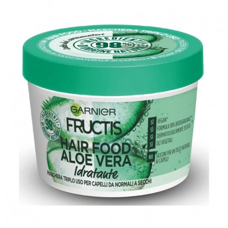 Garnier Fructis Hair Food Aloe Vera 3-in-1 Repairing Mask for Damaged Hair, with 98% ingredients of natural origin.