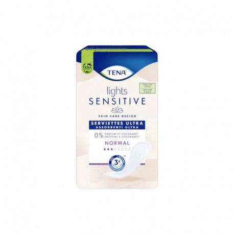 Gli assorbenti ultra Normal per incontinenza di Tena lights SENSITIVE sono adatti in caso di perdite urinarie leggere. Questi assorbenti sono dotati di uno strato superiore e inferiore traspiranti e di un nucleo assorbente che cattura i liquidi e proteggo