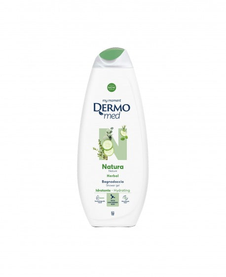 Dermomed Gel de duche NATURA com as suas notas frescas e botânicas respeita a pele, mesmo a mais delicada, tornando-a naturalmente macia e hidratada. Dermatologicamente testado, pH neutro. Com ácido hialurónico. Frag.: Herbal