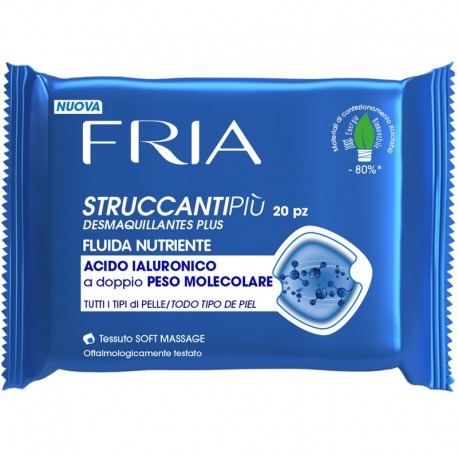 As novíssimas toalhitas FRIA STRUCCANTIPIU’ – FLUIDA NUTRIENTE foram desenvolvidas para desmaquilhar facilmente e delicadamente tanto peles mistas como normais. A fórmula suavemente fluida contém una concentração de Ácido Hialurónico de duplo peso molecular que contribui para dar luminosidade à pele enquanto o extrato de Lavanda e o Óleo de Jojoba promovem una sensação epidérmica regeneradora.