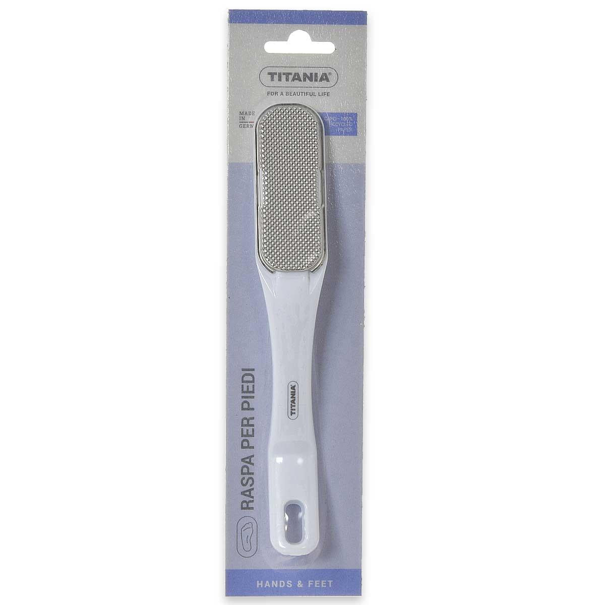 La pelle ruvida e poco curata dei piedi porta a crepe nei talloni, che non sono solo antiestetiche, ma possono anche causare lo sviluppo di spiacevoli malattie. Per mantenere la pelle dei piedi in ottime condizioni è necessario che venga trattata regolarmente con una lima per pedicure. Una delle migliori opzioni tra il vasto assortimento di strumenti per pedicure è la raspa per i piedi del produttore tedesco Titania. Realizzata in acciaio inossidabile di alta qualità, è progettata per trattare le aree secche della pelle dei piedi e dei talloni, eliminando la pelle morta, i vecchi calli ed i duroni. La raspa per pedicure Titania è facile da pulire e comoda da impugnare grazie al suo design ergonomico e alle dimensioni compatte. Può essere facilmente inserita in qualsiasi borsa cosmetica. | | Effettuare un pediluvio per ammorbidire la pelle ruvida dei piedi ed utilizzare la lima sulle zone che necessitano della sua azione. Lavare i piedi con acqua tiepida, asciugare e lubrificare con un'apposita crema per ammorbidire e idratare la pelle.