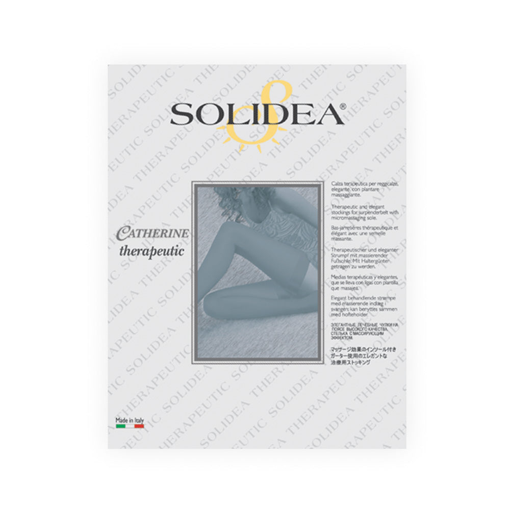 Лечебные чулки для подвязок Solidea Catherine Ccl2 обладает значительной градуированной компрессией 25–32 мм рт. ст. и показан для лечения венозных заболеваний. Открытый носок идеально подходит для людей с вальгусной деформацией большого пальца стопы или проблемами с трофикой кожи.