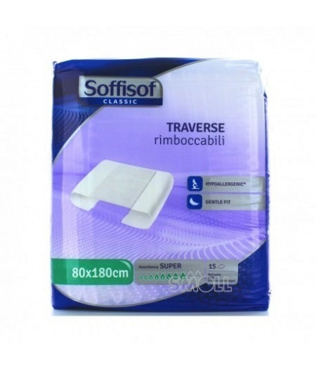 "Soffisof Classic Traversa lideale per proteggere letti, materassi, poltrone e sedie. Il materiale a contatto con la cute in morbido tessuto non tessuto, il materassino interno in fluff di pura cellulosa superassorbente e il lato esterno in polietilene una valida barriera al passaggio dei liquidi. Grazie ai lembi laterali rimboccabili, questa traversa puessere rimboccata sotto il materasso per assicurare la massima protezione del materasso e della biancheria piana."